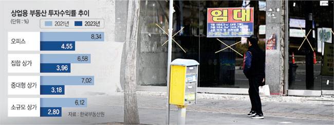 코로나19 팬데믹은 끝났지만 경기 부진이 지속하면서 상업용 부동산 시장은 회복 기미조차 보이지 않고 있다. 특히 상가 투자수익률과 임대료는 내리막길을 걷고 공실률은 계속해서 뛰고 있다. 오피스는 코로나19 엔데믹(풍토병화)에 따른 재택근무 축소로 공실률이 줄고 임대료가 오르긴 했지만, 투자수익률은 여전히 하락을 면치 못하고 있다.