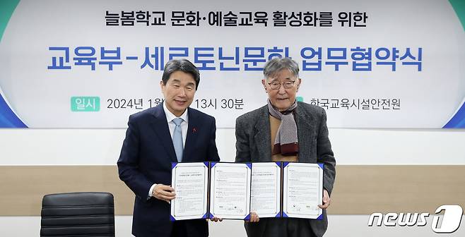 협약에 따라 세로토닌문화는 늘봄학교에 저학년을 대상으로 '세로토닌 예술상상 프로그램'을 운영하고, 예술프로그램 개발·운영, 강사 파견 등 늘봄학교 문화‧예술교육 활성화를 위해 협력할 예정이다. 2024.1.25/뉴스1