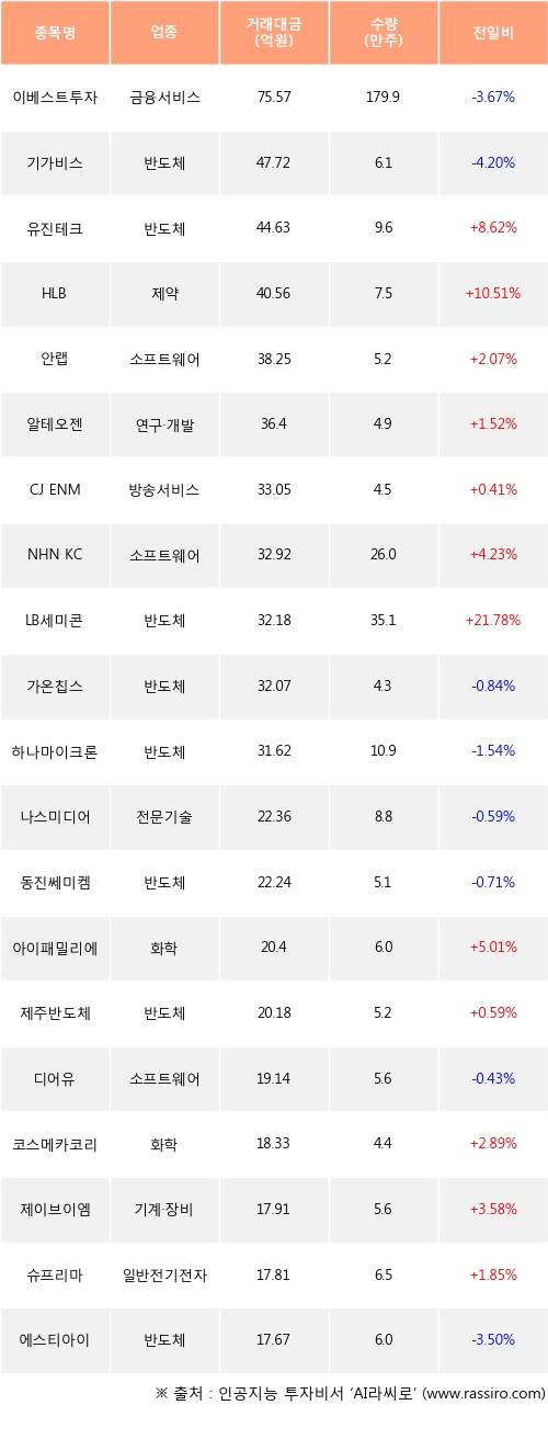 기관 투자자의 순매수 상위 20개 종목은 이베스트투자증권, 기가비스, 유진테크, HLB, 안랩, 알테오젠, CJ ENM, NHN KCP, LB세미콘, 가온칩스등이다.