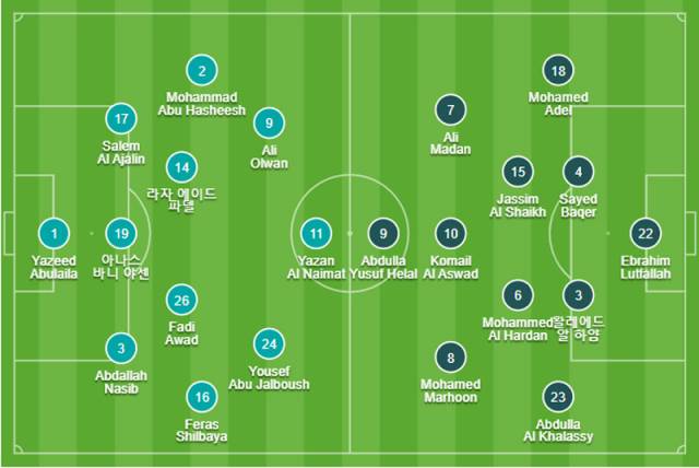 요르단은 3-4-3, 바레인은 4-2-3-1 전형을 기본으로 나섰다. 요르단은 한국전에서 결승골을 터뜨린 야잔 알 나이마트를 원톱으로 내세웠다. 바레인은 압둘라 유수프 헤랄을 원톱 스트라이커로 배치했다. 한국과 경기에서 동점골을 잡아낸 압둘라 알 하샤시는 벤치에서 경기를 시작했다.