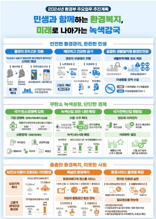 환경부는 26일 차기인 2035 NDC 수립 추진을 포함한 '2024년 주요업무 추진계획'을 발표했다. 환경부는 '민생과 함께하는 환경복지, 미래로 나아가는 녹색강국'을 비전으로 짠 올해 업무계획을 짜고 △안전 △성장 △환경서비스 등 3대 핵심과제를 설정했다.