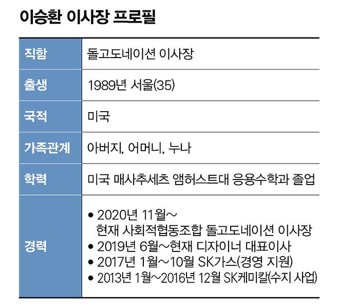 SK그룹 창업자 고(故) 최종건 회장의 외손자인 이승환 돌고도네이션(이하 돌고) 이사장(35)이 처음으로 언론 인터뷰에 응했다. 돌고는 모금한 기부금으로 아동·청소년, 여성, 노인, 동물, 장애인 유관단체에 필요한 물품을 구매해 지원하는 IT 기반 기부 플랫폼이다. 이 이사장은 최근 유명 유튜브 방송에 46분 동안 등장해 대중과 상견례를 했다. 한 달여 전에 93만 구독자를 보유한 유튜브 채널 '휴먼스토리'가 'SK 대기업 재벌 3세의 하루'라는 제목으로 올린 이 이사장 관련 영상은 1월25일 현재 443만 조회 수를 돌파한 것으로 나타났다. 댓글도 9000개 가까이 달렸다. 재벌에 대한 일반인들의 호기심을 증명하는 경이로운 수치다.