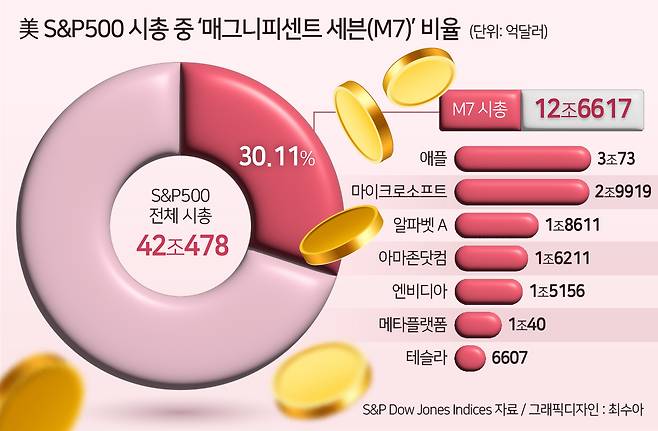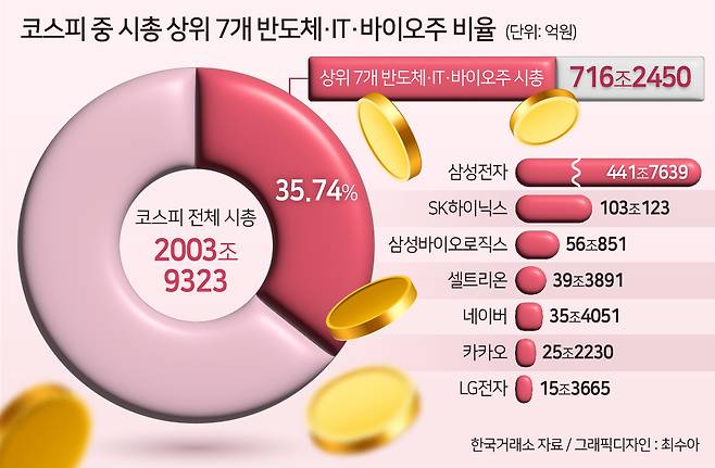 대표적으로 미국 뉴욕증시 3대 지수 중 하나인 스탠더드앤드푸어스(S&P)500지수 시총 중 30.11%가 소위 ‘매그니피센트 세븐(Magnificent Seven, 애플·마이크로소프트·구글·아마존닷컴·엔비디아·메타플랫폼·테슬라)’으로 불리는 7개 대형 기술주가 차지했습니다. 국내 역시 마찬가지인데요. 코스피 지수 전체 시총 중 35.74%가 삼성전자, SK하이닉스, 삼성바이오로직스, 셀트리온, 네이버, 카카오, LG전자 등 시총 상위 7개 반도체·IT·바이오주의 몫이었습니다.
