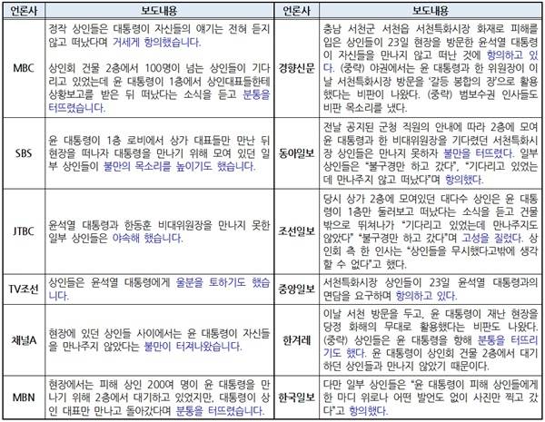다만 언론사별로 약간의 차이가 있는데요. MBC, SBS, JTBC, TV조선은 화재 피해 상인들의 목소리만 전했습니다. 이와 달리 채널A와 MBN은 대통령실 해명을, 동아일보와 조선일보는 당시 현장에 함께했던 국민의힘 소속 김태흠 충남지사의 해명을 덧붙였습니다. 대통령실은 "(윤 대통령이) 현장의 상인들을 만나 충분히 목소리를 들었고, 현장 여건상 예정에 없던 면담을 다 하기는 어려웠다"고 해명했고, 김태흠 충남지사는 "상인분들의 의견은 대통령에게 전달됐다. 2층에도 상인들이 있는 줄 몰라 오해가 생긴 것 같다"고 해명했는데요. 윤 대통령이 화재 피해 상인들을 만나지 않은 데 대한 대통령실과 김태흠 충남지사 해명에도 차이가 있습니다.