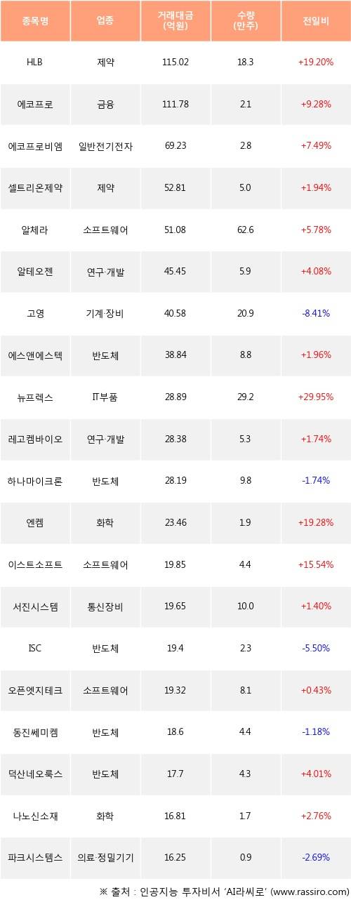기관 투자자의 순매수 상위 20개 종목은 HLB, 에코프로, 에코프로비엠, 셀트리온제약, 알체라, 알테오젠, 고영, 에스앤에스텍, 뉴프렉스, 레고켐바이오등이다.