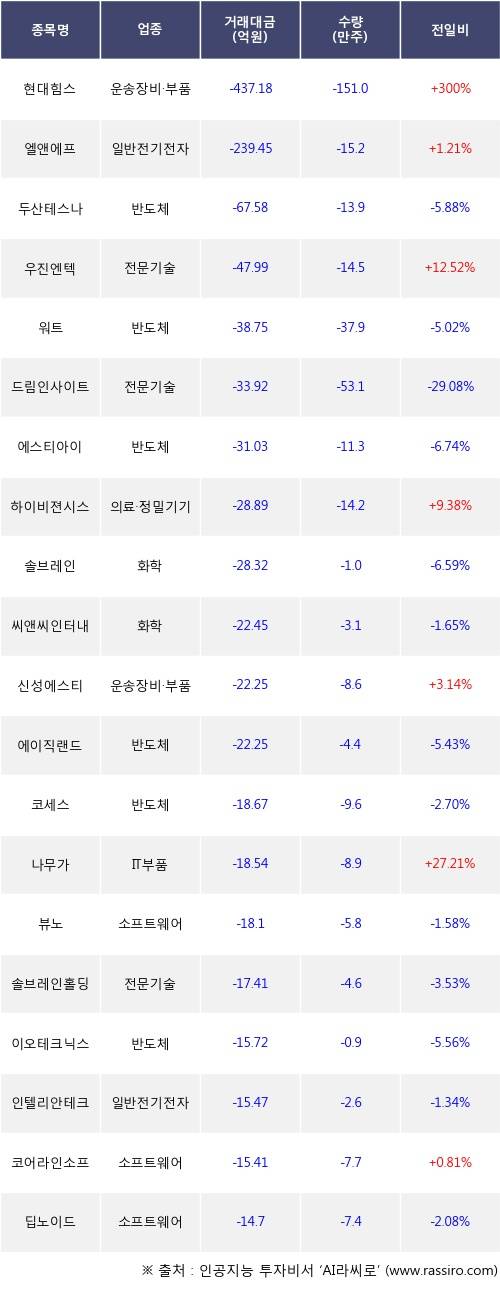 기관 투자자의 순매도 상위 20개 종목은 현대힘스, 엘앤에프, 두산테스나, 우진엔텍, 워트, 드림인사이트, 에스티아이, 하이비젼시스템, 솔브레인, 씨앤씨인터내셔널등이다.