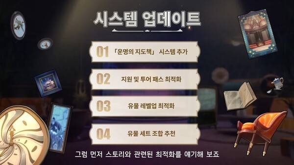 2.0 버전에서는 운명의 지도책 시스템 추가, 지원 및 투어 패스 최적화, 유물 레벨업 최적화, 유물 세트 조합 추천 등 다양한 개선안이 적용될 예정이다.