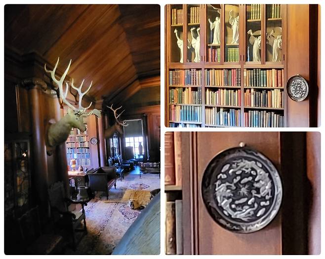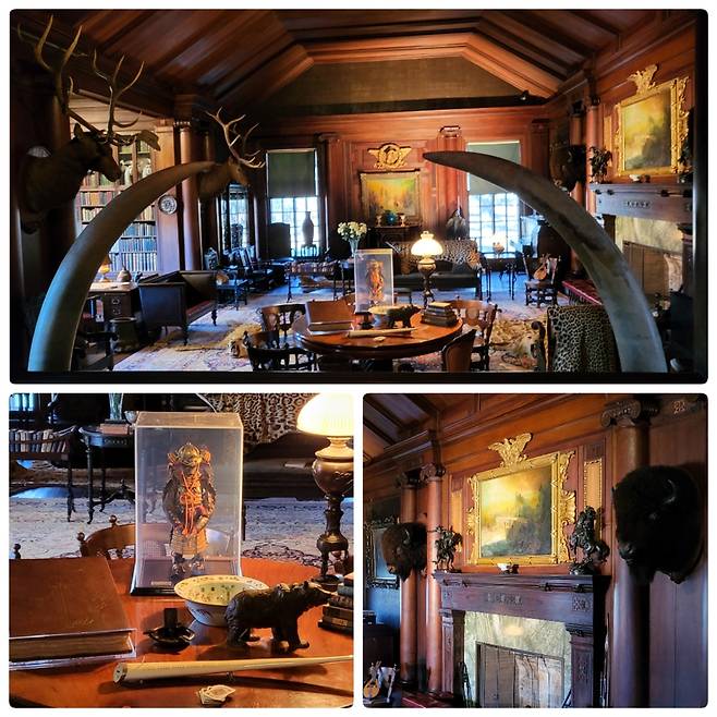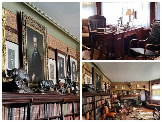 | ▲ 사가모어힐 내의 집무실 루스벨트 대통령의 서재이자 집무실이다. 오른쪽으로 그가 존경했던 여러 대통령들 사이에 가장 큰 아버지의 초상화가 중앙에 배치되었다. 생전에 사용하던 책상 위에 바쁘게 연결되던 전화기가 놓여있다. 사냥꾼답게 저택 어딜 가나 사냥한 야생동물의 머리로 만든 장식품 트로피가 걸려있고 카펫 위에 동물 모피의 깔개도 방마다 깔려있다. 활동가 답지 않게 하버드를 나온 수재고 독서광이었다고 한다. 죽기 직전까지도 글을 쓰던 저술가이기도 하다. |