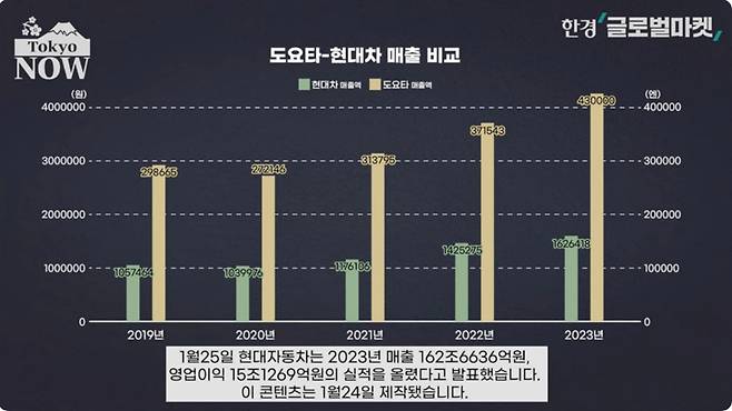 2019년 현대자동차와 도요타의 매출과 순익 차이는 각각 200조원과 20조원이었다. 반면 올해에는 매출과 순익 격차가 270조원과 30조원까지 벌어질 것으로 보인다. 지난 25일 현대자동차는 역대 최대 규모인 2023년 매출 162조6636억원, 영업이익 15조1269억원의 실적을 올렸다고 발표했다. 예상치와 거의 일치했다.