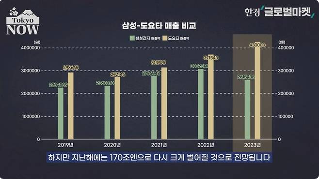 한일 1등 기업인 삼성전자와 도요타자동차의 격차도 벌어졌다. 2022년 도요타와 삼성전자의 매출 격차는 약 30조원까지 좁혀졌다. 하지만 2023년은 170조원까지 벌어질 전망이다.