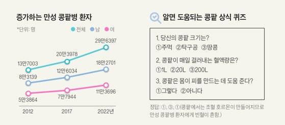 만성 콩팥병의 흔한 원인은 당뇨병·고혈압이다. 말기 신부전으로 투석받는 환자의 70%가량은 당뇨병·고혈압 환자다. 만성질환을 철저히 관리해야 콩팥 기능이 나빠지는 속도를 늦춘다. 콩팥병 가족력이 있으면 증상이 없어도 정기적인 진료를 받는 게 좋다. 콩팥에 물혹이 생겨 기능이 저하되는 ‘다낭성 신장 질환’은 가장 흔한 유전성 콩팥병이다. 자녀에게 50% 확률로 유전된다. 40~50대에 콩팥 기능이 10% 이하로 떨어진 상태에서 발견돼 바로 투석을 받기도 한다.