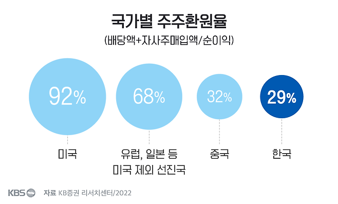 우리는 배당성향도 여전히 낮습니다. 배당이 꾸준히 높게 이뤄지면 투자자들은 해마다 은행 이자처럼 배당수익을 기다리고, 이는 자연스럽게 장기투자로 이어집니다. 우리 상장사들은 자사주매입이나 배당을 통해 이익을 얼마나 주주들에게 돌려줄까? 배당액과 자사주 매입액을 순이익으로 나눠 보면 '주주환원율'이 나옵니다. 국내 상장사의 10년 평균 주주환원율은 29%입니다. 반면 미국은 92%에 달합니다. 미국을 제외한 유럽과 일본 등 선진국의 주주환원율은 68%입니다. 우리는 32%인 중국보다 낮습니다.