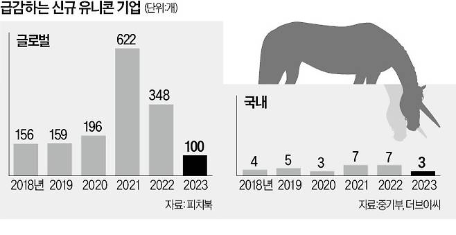 기업가치 10억달러가 넘는 유니콘기업의 증가세가 눈에 띄게 둔화했다. 글로벌 시장에서는 신규 유니콘기업이 1년 전보다 70% 넘게 감소했다. 국내에서도 새로 유니콘기업이 된 곳이 전년의 절반 수준으로 줄었다.