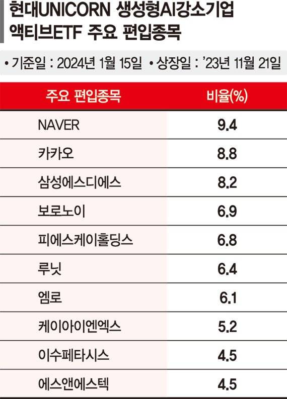 28일 금융투자업계에 따르면 '현대UNICORN 생성형AI강소기업 액티브ETF'는 지난해 11월 21일 상장, 그해 11월 말 순자산(101억원)이 100억원을 넘었고, 이달 15일 기준 592억원으로 불어났다. 연초 이후 140억원 이상이 유입됐다. 이 ETF는 'iSelect AI지수'를 비교지수로 하고, 현대자산운용의 대표 중소형주 펀드인 '현대강소기업 펀드'의 AI 관련 종목을 복제해 알파 수익을 추구한다.