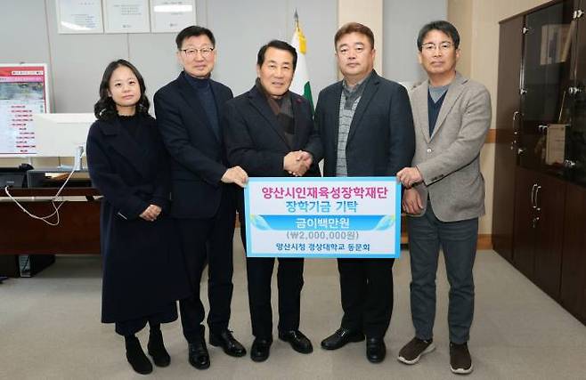 양산시청 경상대학교 동문회(회장 김조은)가 장학금 200만원을 지난 26일 양산시인재육성장학재단에 전달했다.