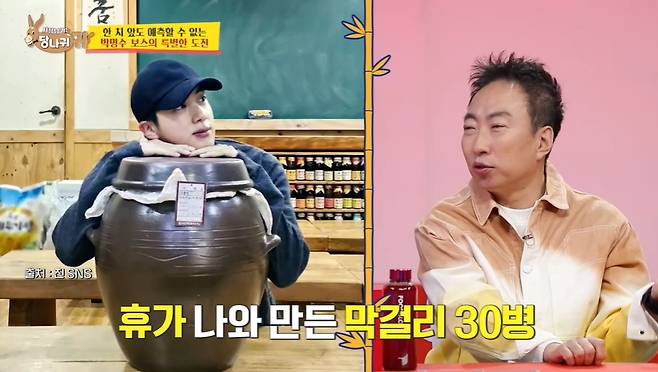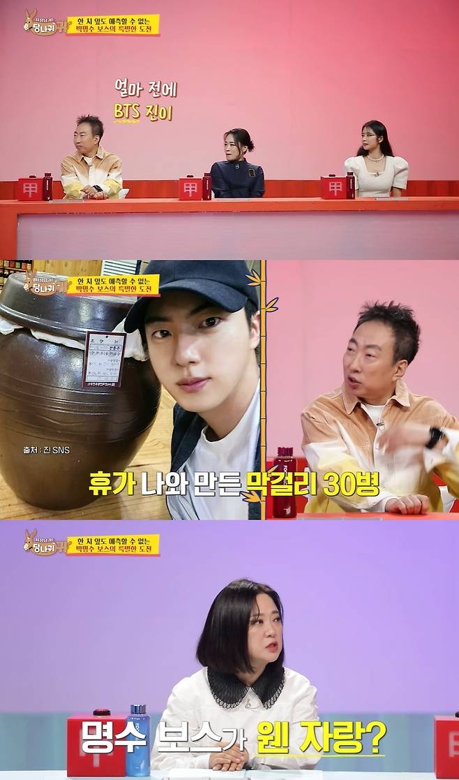 이날 박명수는 후배 아이돌들과의 깜짝 친분을 공개했다. 박명수는 "얼마 전 방탄소년단(BTS) 진이 휴가를 나와 취미로 막걸리 30병을 만들었다"라고 운을 뗐다. 이어 "그걸 지인들에게 한 병씩 돌렸는데, 30병 중 한 병이 내 것이었다"라며 진에게 막걸리 선물을 받았다고 자랑했다.