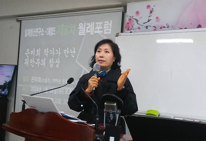 | ▲ 28일 일제청산연구소 제8차 월례포럼에서 발표하는 소설가 은미희 작가. |