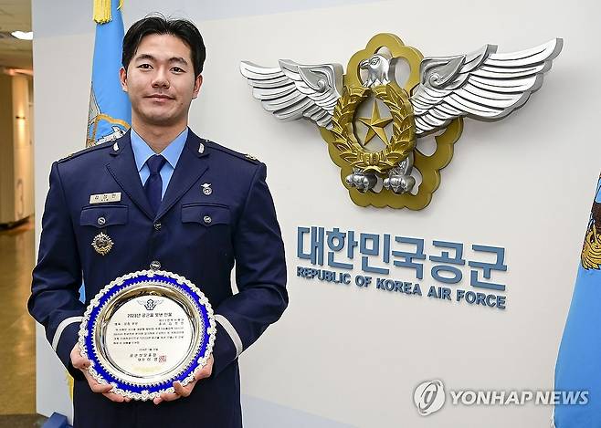 (서울=연합뉴스) 29일 충남 계룡시 공군본부에서 열린 '2023년 공군을 빛낸 인물·단체' 시상식에서 '체육 부문'에서 공군을 빛낸 인물로 선발된 제11전투비행단 항공정비전대 김정민 중사가 기념 촬영하고 있다. 2024.1.29 [공군 제공. 재판매 및 DB 금지]