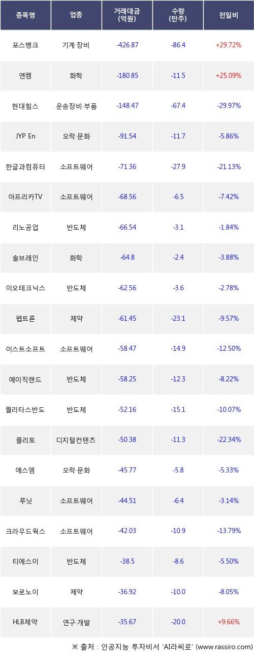 기관 투자자의 순매도 상위 20개 종목은 포스뱅크, 엔켐, 현대힘스, JYP Ent., 한글과컴퓨터, 아프리카TV, 리노공업, 솔브레인, 이오테크닉스, 펩트론등이다.