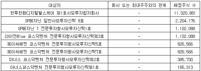제3자배정 대상자는 한투한화디지털헬스케어 제1호사모투자합자회사(1천102만881주), SP메자닌 일반사모투자신탁 8호(220만4천176주) 등이다.