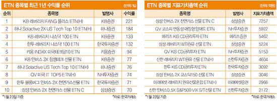 그런가 하면 최근 1년간 수익률을 기준으로 보면 레버리지 상품이 순위권에 다수 포진했다.