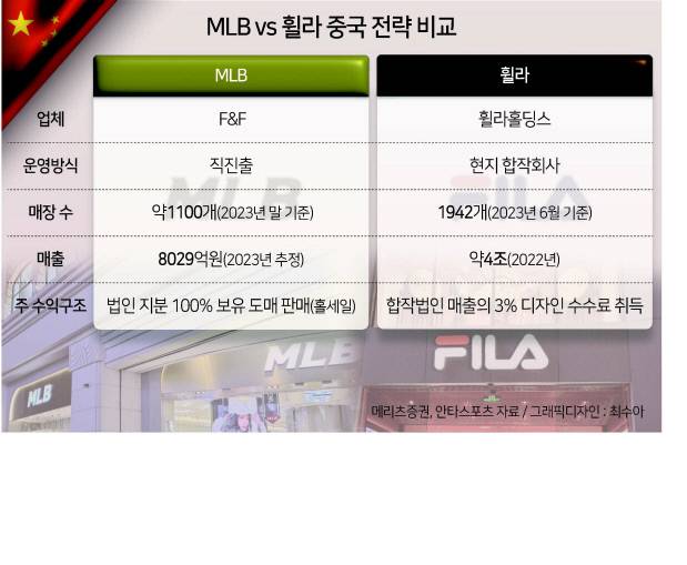 두 회사의 의존도 차이는 다른 진출 방식 때문이다. MLB 브랜드를 운영하는 F&F는 직진출 방식으로 2019년부터 중국 사업을 시작했다. 현지 유통망을 가진 대리상을 통한 홀세일 방식(도매판매)이 주된 사업 방식이다. 메리츠증권에 따르면 지난해 F&F 중국법인의 대리점 판매 비중(추정)은 77%다.