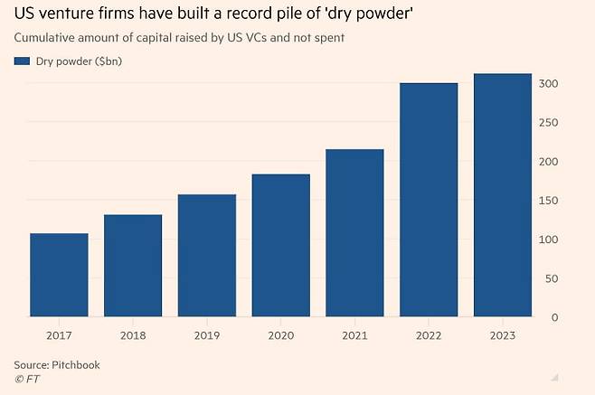 글로벌 시장조사업체 피치북에 따르면 미국 VC 업계에서 아직 집행되지 않은 미소진 투자 자금(드라이파우더) 규모는 현재 3110억달러(약 413조6000억원)에 달한다. 팬데믹 기간 시중에 유동성이 넘쳐난 덕에 4350억달러(약 578조4000억원)어치 역대급 규모의 투자 자금이 조달됐는데, 이 중 실제 집행된 건 절반뿐이었다.