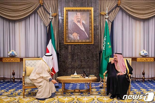 (리야드 AFP=뉴스1) 우동명 기자 = 무함마드 빈 살만 사우디아라비아 왕세자가 30일 (현지시간) 리야드를 공식 방문한 미샬 알 아흐마드 알 자베르 알 사바 쿠웨이트 국왕과 회담을 하고 있다. 2024.1.31