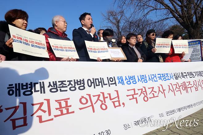 국회 앞에 '해병대 고 채 상병 사망 사건 국정조사'를 요구하는 목소리와 함께 큰 북소리가 울려 퍼졌다. 채 상병과 함께 집중호우 실종자 수색 중 급류에 휩쓸렸다 겨우 생존한 장병의 어머니가 힘껏 친 북소리였다. 생존 장병 어머니뿐만 아니라 고 윤승주 일병, 고 홍정기 일병, 고 이예람 중사 유족도 연이어 북을 울리며 "진실을 밝히는 일이 죽음을 헛되이 하지 않고 많은 생명을 살리는 길"이라고 목소리를 높였다.