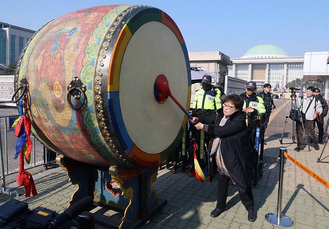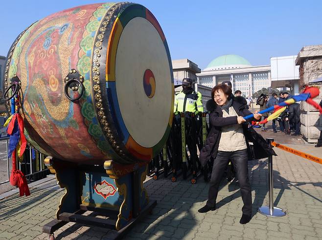 | ▲ 군 복무 중 발병한 백혈병을 제때 치료 받지 못해 숨진 고 홍정기 일병의 어머니 박미숙씨가 31일 오전 서울 여의도 국회 앞에서 해병대 고 채 상병 사망 사건 국정조사를 촉구하며 북을 치고 있다. |