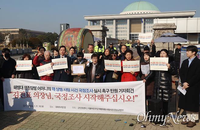 생존 장병 어머니, 여러 군 사망사고 유족, 군인권센터, 더불어민주당 해병대원 사망사건 진상규명TF는 31일 오전 10시 30분 서울 영등포구 국회 정문 앞에서 기자회견을 열고 "국정조사 개시 요건이 갖춰졌음에도 국민의힘이 반대하고 김진표 국회의장이 절차를 진행하지 않아 3개월째 시작하지 못하고 있다"라며 신속한 국정조사 진행을 촉구했다.