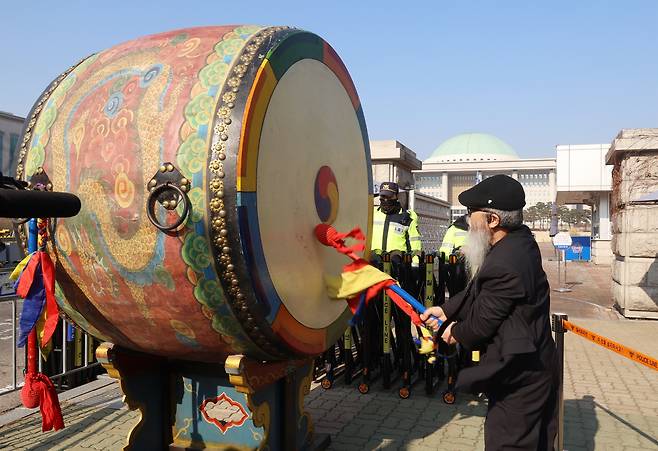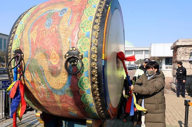 | ▲ 공군 내 성폭력 사건으로 숨진 고 이예람 중사의 아버지 이주완씨가 31일 오전 서울 여의도 국회 앞에서 해병대 고 채 상병 사망 사건 국정조사를 촉구하며 북을 치고 있다. |