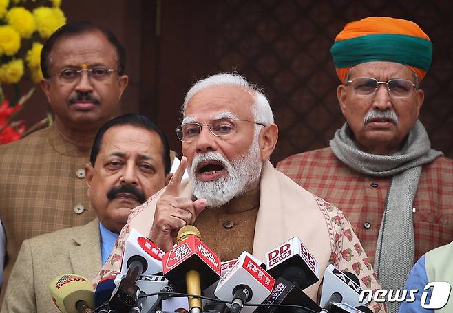 (뉴델리 로이터=뉴스1) 정지윤 기자 = 31일(현지시간) 인도 뉴델리에서 열린 예산회의 첫날 나렌드라 모디 인도 총리가 의회에 도착해 언론에 연설하고 있다. 2024.01.31