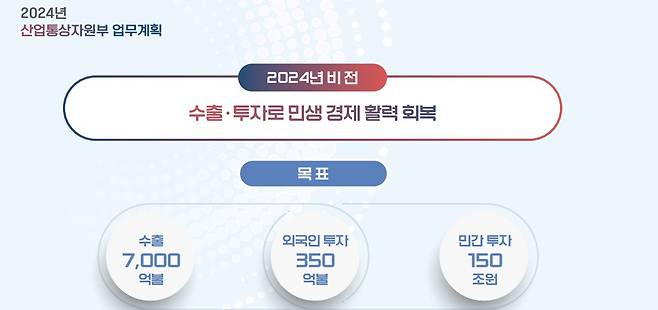산업통상자원부는 31일 ▷150조원으로 전망되는 민간 투자 지원 ▷사상 최대인 7000억달러 수출 및 외국인 투자 유치 350억달러 달성 ▷무탄소 에너지 대전환 등 주요 분야별 목표를 담은 2024년 업무계획을 발표했다.