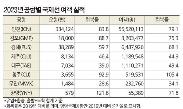 2023년 국제선 항공 여객은 해외여행 수요에 힘입어 회복세가 두드러졌다. 전체적으로 회복을 향해 질주한 한해였지만 노선이나 항공사, 공항 등에 따라 회복세가 고르지는 않았다.
