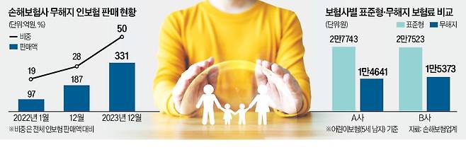 31일 보험업계에 따르면 인(人)보험 시장에서 무해지 보험 판매 비중은 2022년 1월 19.5%에서 지난해 12월 49.8%로 치솟았다. 무해지 보험은 납입 기간에 해약하면 환급금이 한 푼도 없는 상품이다. 대신 보험료가 30% 이상 싸다. 국내에는 2015년 7월 등장했다. 처음에는 순수 보장성 20년 이하 전기납 상품에만 허용됐지만 2019년 규제 완화로 시장 규모가 급격히 커졌다. 당장 보험료를 아끼려는 소비자를 중심으로 인기를 끌고 있다.