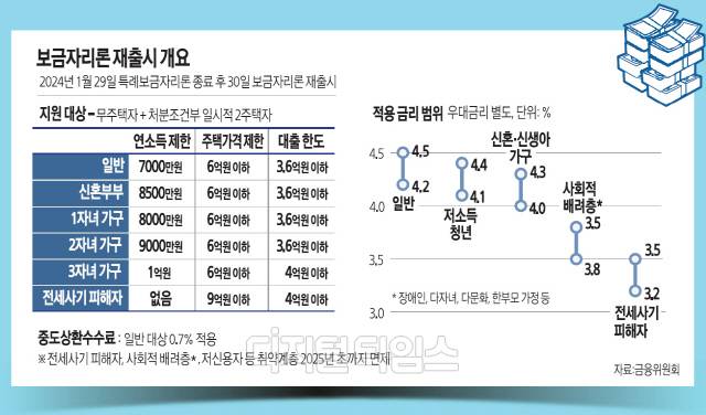 금리는 특례보금자리론보다 0.3%포인트 낮은 연 4.2~4.5% 수준이다. 취약계층은 대출금리가 3%대 중반으로 낮아진다. 전세사기피해자는 3.2~3.5%, 다자녀가구와 다문화, 한부모 등 사회적 배려층에는 3.5~3.8%의 금리로 대출을 실행한다. 가장 금리가 높은 저소득 청년도 시중금리보다 낮은 4.1~4.4%로 주택구입 자금을 빌릴 수 있다.