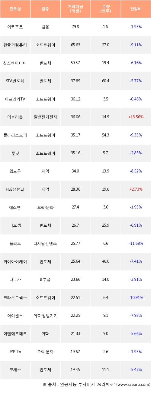 에브리봇, HLB생명과학 등은 전일 대비 주가가 상승했고, 에코프로, 한글과컴퓨터, 칩스앤미디어 등은 주가가 하락했다.