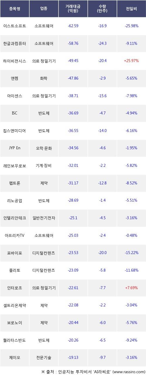 기관 투자자의 순매도 상위 20개 종목은 이스트소프트, 한글과컴퓨터, 하이비젼시스템, 엔켐, 아이센스, ISC, 칩스앤미디어, JYP Ent., 레인보우로보틱스, 펩트론등이다.