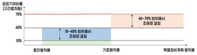 관건이었던 공공기여 비율은 사업성 확보를 위해 두 구간으로 차등화해 적용하기로 했다. 우선 노후계획도시별로 도로·상하수도·학교·공원 등 기반시설 확충을 고려한 기준 용적률이 제시된다. 현재 아파트 용적률에서 기준 용적률까지 증가하는 부분은 10~40% 범위에서 공공기여 비율이 산출된다. 여기에 기준 용적률에서 특별정비구역으로 결정돼 더 늘어나는 용적률에 대해서는 40~70% 범위에서 공공기여를 하게 된다. 예를 들어 기준 용적률이 300%이고 단지 용적률이 180%에서 330%로 증가한 경우 총공공기여 비율은 33%가 된다.