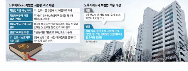 정부가 노후 도시의 정비 기준을 담은 ‘노후계획도시정비특별법’의 대상을 늘리면서 1기 신도시(분당·일산·중동·평촌·산본)뿐 아니라 서울 및 수도권, 지방 노후 택지 등 총 215만 가구도 특별법을 적용받아 재건축을 할 수 있게 됐다. 면적이 100만 ㎡ 이하인 부지는 인근 유휴 부지나 구도심과 통합해 개발할 수 있고 산업단지 배후 주거 단지도 적용 대상에 포함됐다.