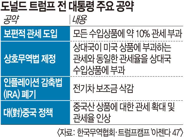 수입 자동차에 관세를 부과하고, 인플레이션 감축법(IRA)을 폐기하겠다는 자국 산업 위주 공약이 현실화하면 국내 자동차와 배터리, 이차전지 업계의 타격은 불가피할 전망이다.