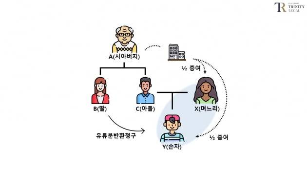 시아버지는 그 동안 고생했다면서 저(X)와 손자(Y)에게 빌딩 한채를 2분의 1씩 증여해주셨는데 그 때가 2010년이었습니다. 그로부터 4년 후 남편(C)이 교통사고로 사망했습니다. 이후 2021년에 시아버지도 지병으로 돌아가셨습니다.