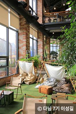 글린공원은 ‘카페에서 즐기는 피크닉’이라는 콘셉트를 가진 2층 높이의 대형 수목원 카페입니다. 이곳은 1층과 2층이 전혀 다른 분위기로 꾸며져 있으며, 2층에는 해먹이 세팅되어 있어 독특한 경험을 할 수 있는데요. 또한, 작은 시냇물이 흐르는 것처럼 꾸며진 공간에는 캠핑 텐트와 의자가 세팅되어 있어 마치 캠핑을 온 듯 한 기분을 느낄 수 있습니다. 1층 메인 공간에 조성된 수목원을 바라보며 커피 한잔의 여유를 즐겨보세요.