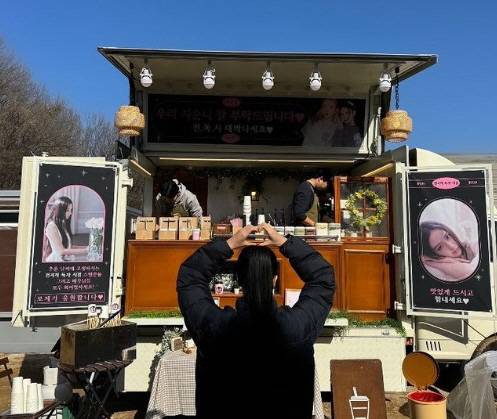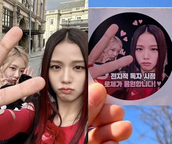 공개한 사진에는 로제가 보내온 커피차 앞에서 하트 포즈를 취하고 있는 지수의 뒷모습이 담겼다. 로제는 "전독시 대박나세요", "맛있게 드시고 힘내세요", "전지적 독자시점 로제가 응원합니다"는 등의 문구로 지수의 영화 촬영을 응원했다.