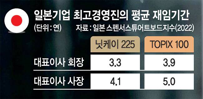 제2차 세계대전 후 재벌 해체를 겪은 일본의 기업들은 대부분 소유가 분산돼 있다. 일본 ‘스펜서스튜어트보드’ 지수(2022년)에 따르면 도쇼주가지수(東證株價指數·TOPIX) 100 기업의 대표이사 회장의 평균 임기는 3.9년, 대표이사 사장 또는 CEO의 평균 임기는 5년으로 조사됐다. 미국도 S&P500의 평균 CEO 재임 기간은 7.2년, CEO 재임 기간의 중앙값은 4.8년이다. 일본철강기업의 CEO 역시 길어야 5년 재직하는 것이 불문율처럼 돼 있다.