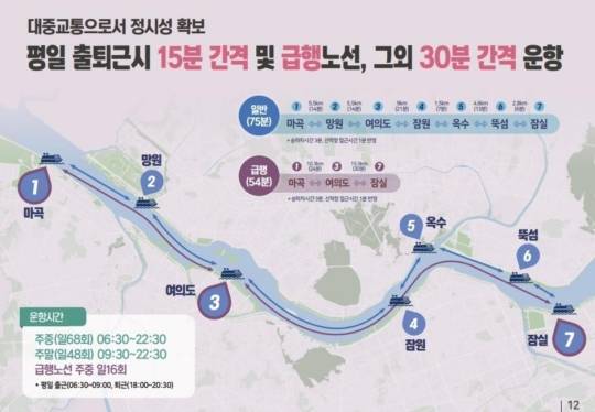 리버버스는 마곡~잠실 사이 총 7개 선착장을 출퇴근 시간 15분 간격, 평일 1일 68회 상·하행 편도로 운항한다.