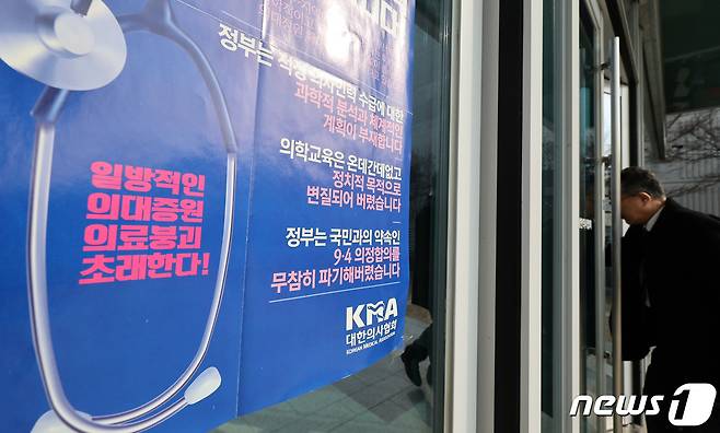 (서울=뉴스1) 장수영 기자 = 윤석열 대통령이 의료개혁 관련 내용을 발표한 1일 서울 용산구 대한의사협회로 관계자가 들어가고 있다.