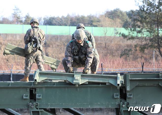 (춘천=뉴스1) 이종재 기자 = 지난달 30일 육군 2군단 예하 2공병여단 장병들이 강원 춘천 일대에서 간편조립교를 구축하고 있다.