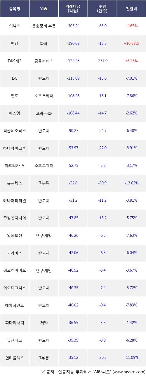 기관 투자자의 순매도 상위 20개 종목은 이닉스, 엔켐, IBKS제24호스팩, ISC, 엠로, 에스엠, 덕산네오룩스, 하나마이크론, 아프리카TV, 뉴프렉스등이다.